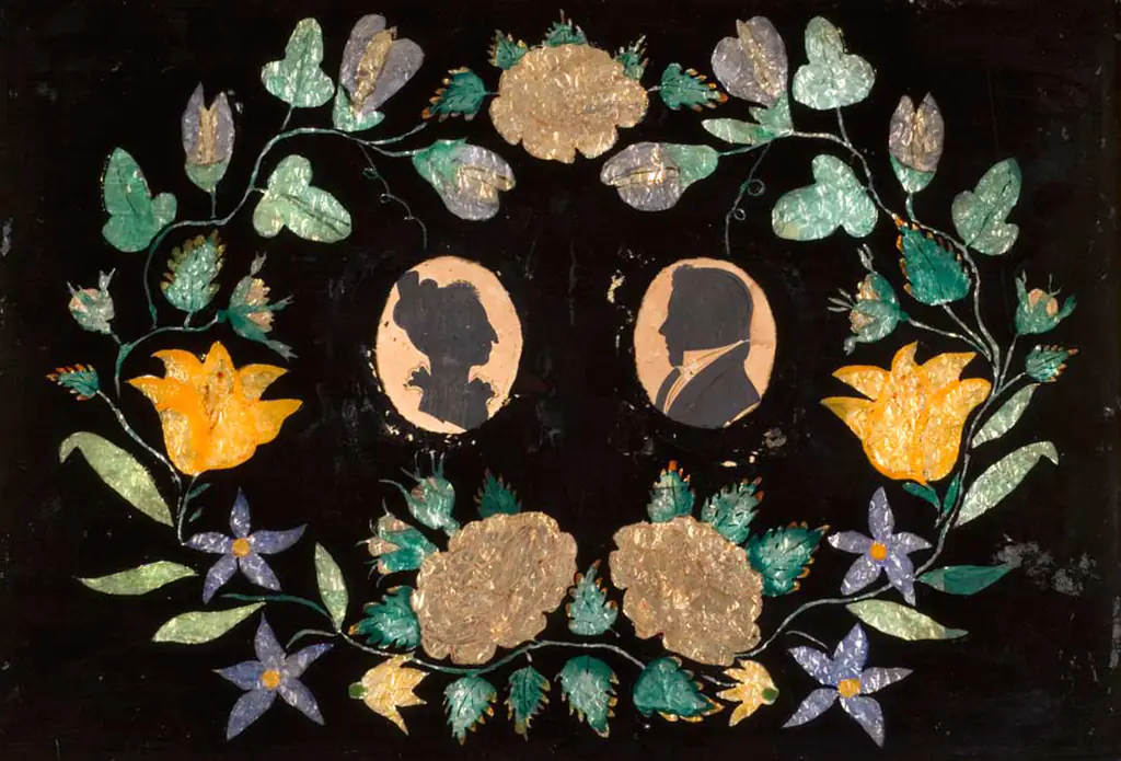 不只是歐洲,在美國19世紀的民間藝術中,也出現了類似風格的金鏤畫(Tinsel Painting)。例如 *Wreath of Flowers with Silhouettes of Man and Woman*,便以錫箔與玻璃交疊出立體光澤效果,是家庭與紀念畫常見的形式。