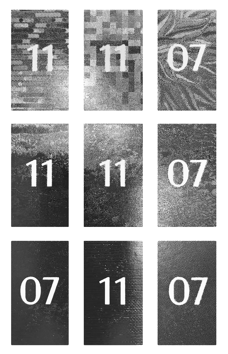 - 動態視覺的精算邏輯透過角度微差設計與線條密度規劃,我們將圖像的色彩、明暗與動勢重新編碼,使其能隨觀看角度產生「閃動」、「轉色」、「光蘊」等動態視覺效果。這是光影的計算設計,也是設計人可運用的新語彙。