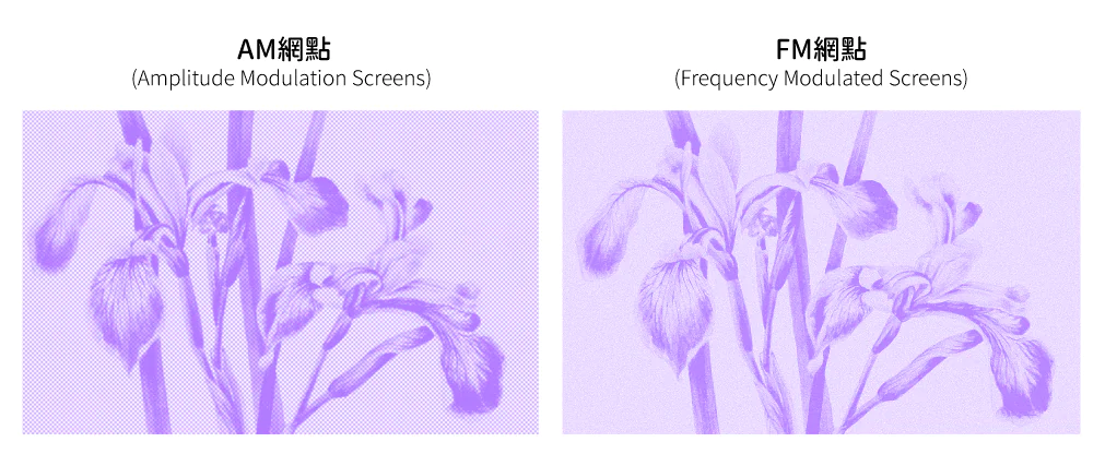 - FM 網點(Frequency Modulated Screening),這項技術的核心精神,在於徹底顛覆了傳統印刷的規律性思維。相較於常見的 AM 網點(Amplitude Modulated Screening) 以大小不一的網點來表現色彩深淺,FM 網點則是透過固定大小的極細微墨點,以不規則的疏密分佈來重現影像。