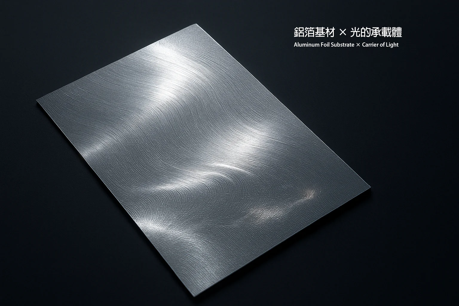 作品基底採用結構穩定的白卡紙,表面覆以電鍍鋁箔。鋁箔不僅強化反射性,更像為整體畫面鋪設一層「光的舞台幕布」,使微小壓紋得以精準呈現。每一束光的折射與漫射,皆有跡可循。