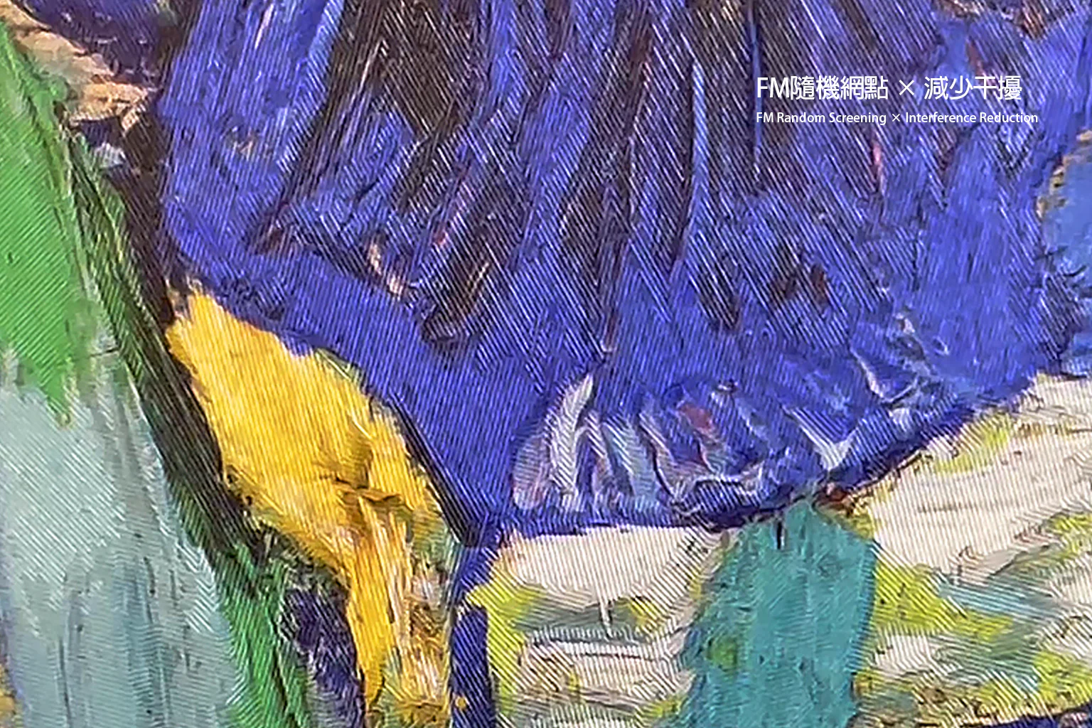 傳統印刷常因規律網點排列產生「網花」干擾,我們在技術端採用 FM(Frequency Modulated)隨機網點技術,讓墨點以非規則、極細分布方式呈現,避免壓紋紋理與色彩網點產生交錯干擾,進一步提升圖像細節與整體通透感。