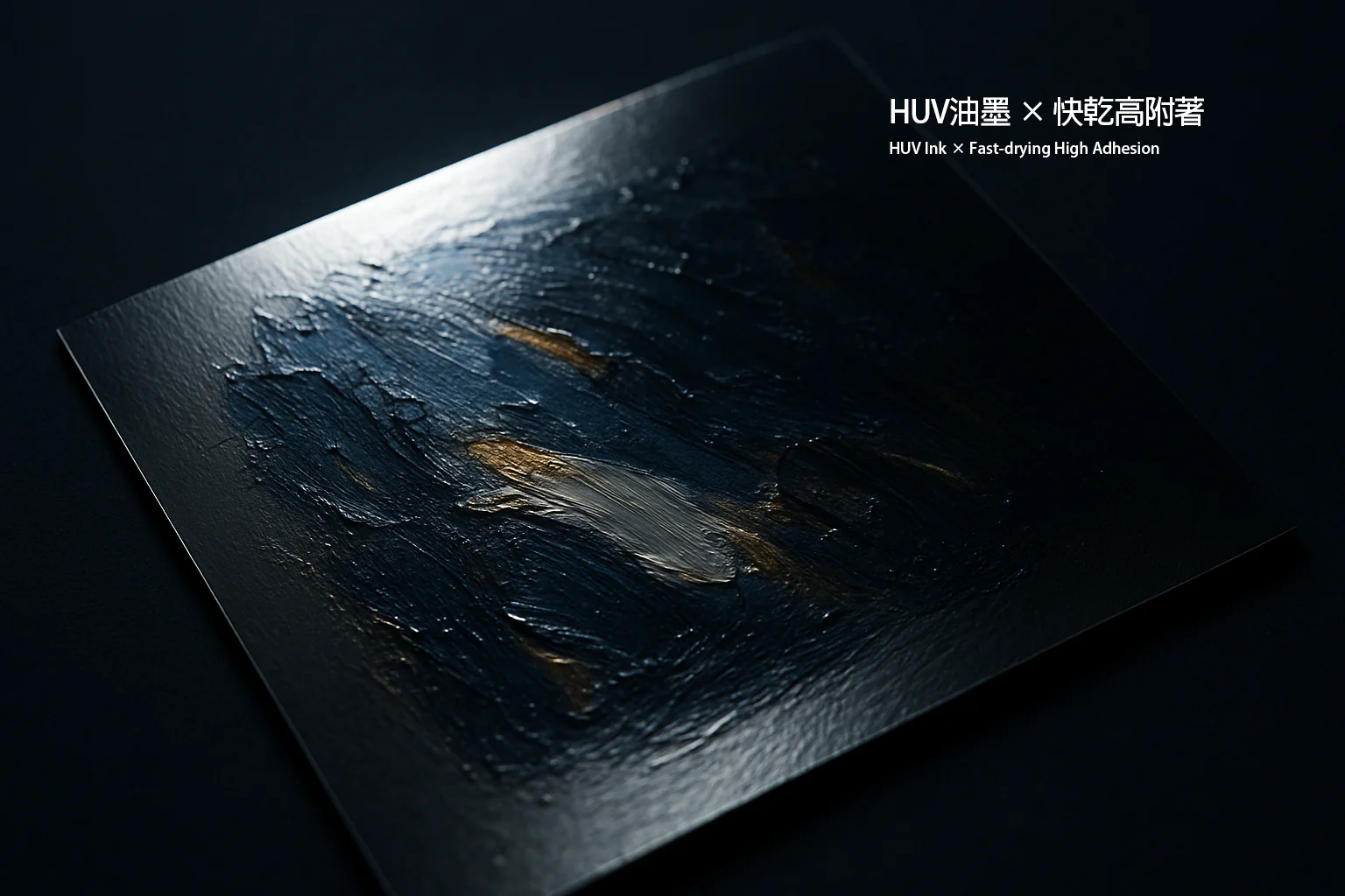 在高反光的鋁箔基底上印刷,傳統油墨容易出現附著不良、乾燥緩慢或色彩暗淡等問題。為克服這些挑戰,作品使用 HUV(High-UV)固化油墨,其具備高飽和、瞬間乾燥與耐刮特性,能精準還原畫面色階與層次。