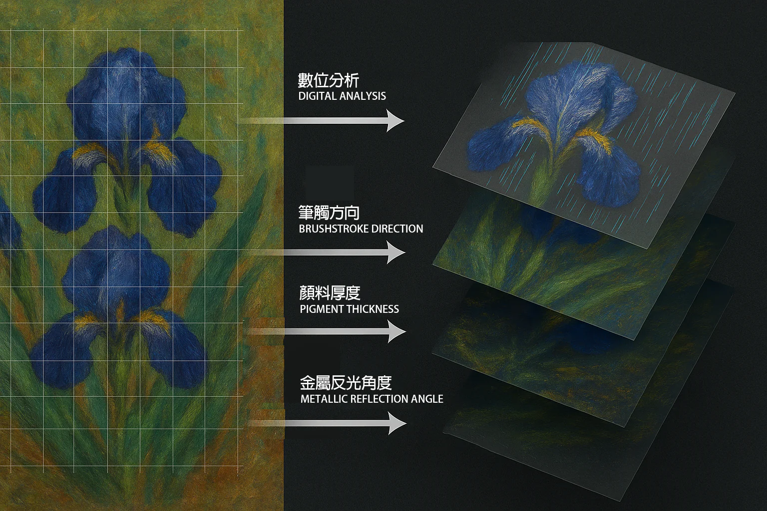 中茂以高解析掃描與影像分色演算技術,將原畫筆觸方向、顏料堆疊厚度與金屬反光角度等資訊,解構為可轉譯的數位圖層。這不只是色彩處理,而是一場關於「光線行為」的結構分析。