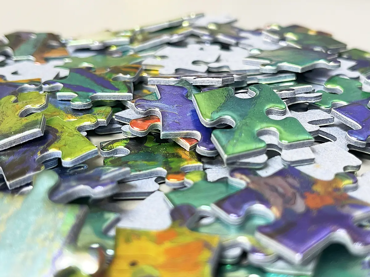 關鍵技術之一,是透過鋼版蝕刻方式,在模具上製造出極細緻的光影紋理。這些紋理並非肉眼可見的裝飾線條,而是如髮絲般精微的物理高低差,經由壓印轉移至拼圖表面,形成能夠反射光線的微型地形。當拼圖在不同角度下觀看時,表面的反光效果會隨之變化,產生如畫面在呼吸般的動態光澤。